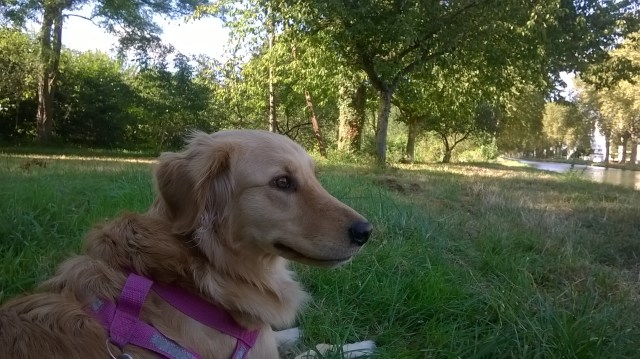 Da es hier ziemlich warm ist, war ich mit Blondi wieder etwas am Kanal unterwegs. Die Plantanen spenden Schatten und das Wasser fließt langsam vor sich her. Die Stimmung ist gut. Entspannt. Gelassen. Ab und zu sind ein paar Enten auf dem Kanal unterwegs oder das Schwanenpärchen zu sehen.