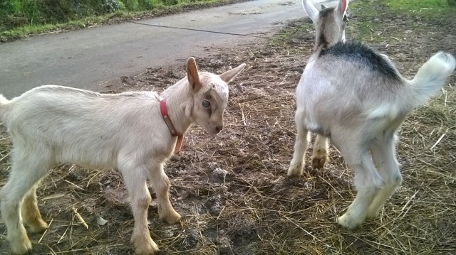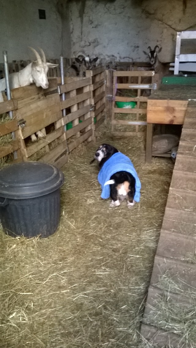 Da es heute so schön war, haben auch die Zicklein etwas Auslauf bekommen. Die beiden haben richtig viele Luftsprünge gemacht und Nana wollte gar nicht wieder ins Haus. Und Captain hat die beiden super vor den Gänsen beschützt, die waren heute nämlich mal wieder ziemlich biestig.
