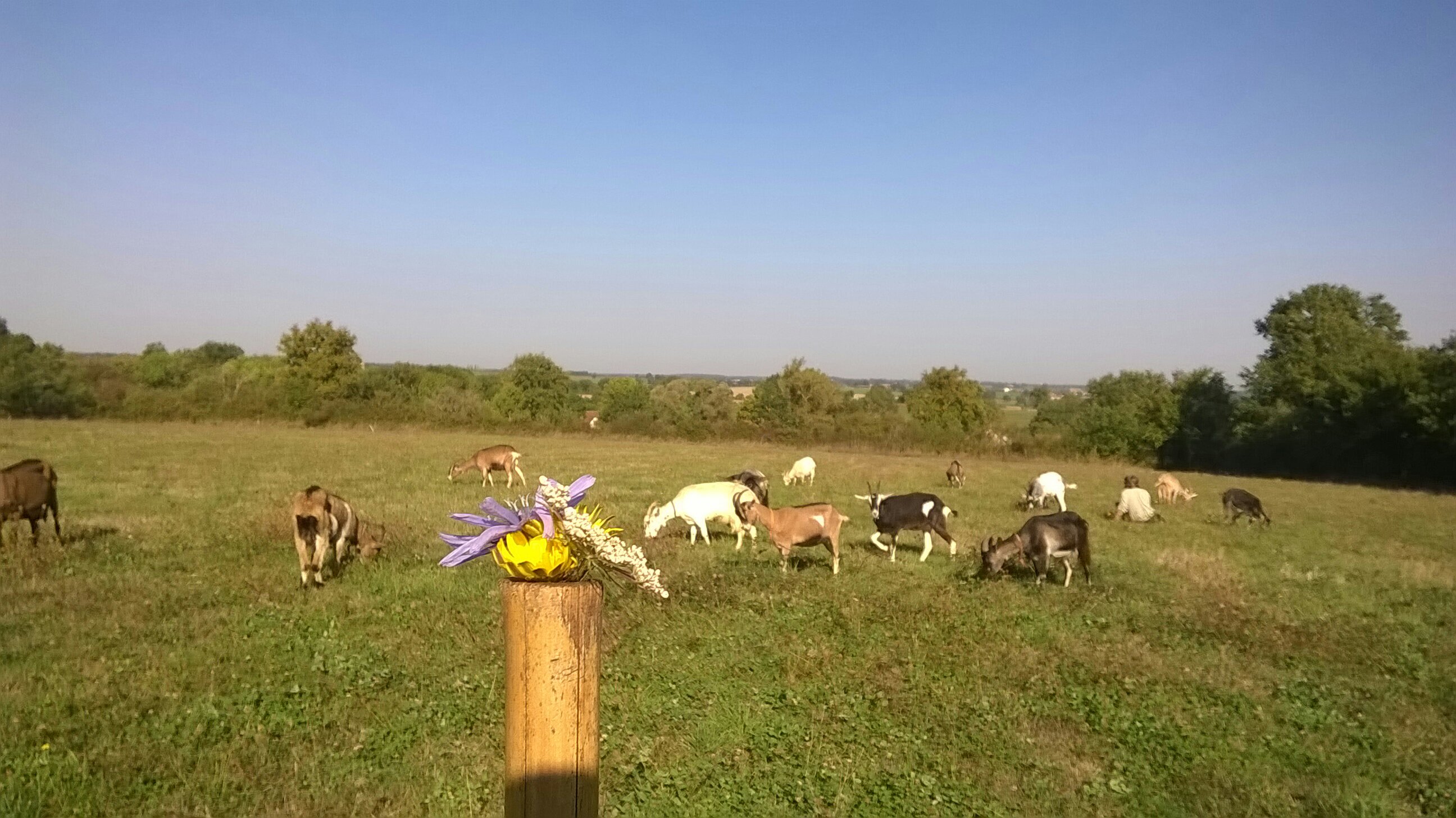Nachdwm die Ziegen heute gemolken waren ging es für alle gemeinsam auf eine andere Wiese. Da Paarungszeit ist und die ganz jungen Ziegen von diesem Jahr noch keine Babys bekommen sollen, mussten sie erstmal im Stall bleiben. Auf der Weide durften alle Ziegen frei laufen. Wir mussten nur aufpassen, dass sie nicht zu den Eichen am Rand liefen und zu viele Eicheln fressen. Es war wirklich schön den Ziegen beim fressen zuzusehen. Sie strahlen dabei eine wunderbare Ruhe aus. Helix (eine der Ziegen) hat sich zwischendurch zu Thierry gelegt. Das war ein schönes Bild. Gegen Mittag haben wir dann die Weide gewechselt und sie erstmal alle wieder einzeln fest gemacht.