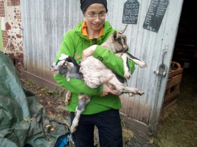 Ich fand wir waren leider etwas zu früh da, da die Bieden noch keine Stunde alt waren und sofort von ihrer Mutter weg genommen wurden. Traumafrei geht definitiv anders. Naja und die Mutter mit Chlorzusatz im Wasser waschen ist auch nicht gerade nett. Die Beiden kamen dann gleich mit ins Haus. Während Thierry die Mutter molk, damit die Babys die erste Milch bekommen konnten. Jedoch waren die Flaschen nicht aufzufinden. Thomas und Thierry sind Flaschen kaufen gefahren und ich habe bei den restlichen Ziegen begonnen zu füttern und zu melken.