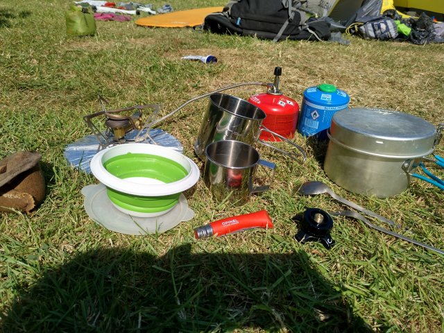 Unser Kocher ist ein Primus Spider Stove 2. Er ist wirklich jeden cent Wert und wir freuen uns jeden Tag wieder, wie stabil er steht und wie gut er zu bedienen ist. Kein wackeln und ruckeln und super klein zu packen ist er auch noch. Unter den Kocher kommt ein Kreis aus Aluminium, um die Wärme des Kochers optimal zu nutzen. Was uns noch fehlt, ist ein möglichst leichter Windschutz. Bis jetzt halten unser Rucksäcke nämlich dafür her.