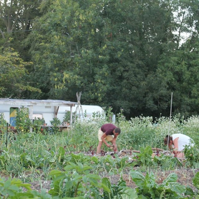 Kurz bevor wir in den Wald kamen, hat Thomas bei einer Familie, die gerade im Garten saß, nach Wasser gefragt. Die Frau hat uns frisches kaltes Wasser gegeben. Das war so gut. Am Ende ds Waldes sollte eine Kapelle sein, laut Karte. Die Kapelle war aber leider in einem privatem Garten. Wir hofften dort einen Schlafplatz zu finden. Thomas hat dann einen Sportplatz in der Karte entdeckt. Dort haben wir erstmal unser Lager aufgeschlagen. Ich habe mal eben anderthalb Stunden geschlafen und geträumt. Das tat wirklich gut. Thomas war zwischendurch neues Wasser holen, dabei hat er einen riesengroßen Permakulturgarten entdeckt. Der Besitzer war noch nicht da, nur eine Helferin war da. Sie meinte es wäre sicher kein Problem, wenn wir dort schlafen. Thomas ist dann nochmal fragen gegangen, als der Besitzer, Alexandre, da war. Jetzt steht unser Zelt am Rand des Gartens, neben dem der Helferin. Wir hatten genügend Wasser um uns zu waschen und dr Garten ist wirklich toll. So weitläufig und überall gibt es etwas zu entdecken. Hier gibt es auch Hühner, eine Ziege und ein Schaf. Das Schaf sah total lustig aus. Es hat gaaaanz viel Fell und nur einen relativ kleinen Kopf. Es wirkt wie ein laufendes Kissen.