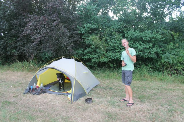 Wir stehen heute hinter einer kleinen Kapelle. Als wir ankamen waren die Hunde so müde, dass sie obwohl sie frei waren, sich nicht weg bewegt haben. Das Gewitter war auch schon zu hören und zu sehen. Wir haben also schnell das Zelt aufgebaut und alles fertig gemacht, damit wir nicht naß werden. Und wir waren tatsächlich vor dem Gewitter hier fertig. Kurz bevor das Gewitter hier war, konnten wir noch eine Rehfamilie beobachten, wie sie auf dem Feld stand. Total schön. Die Mutter hat uns auch gesehen, aber sie sind trotzdem stehen geblieben. Nach dem Gewitter kamen sie wieder. Das Gewitter war ziemlich laut und es gab erst kaum Regen. Jetzt plätschert der Regen gemütlich auf unser Zelt und wir hören ihm zu und genießen es.