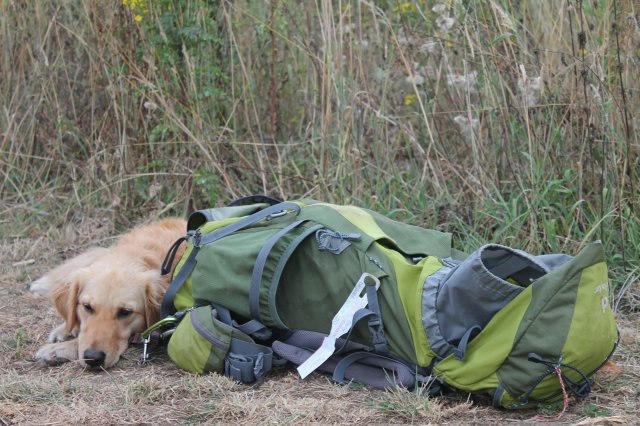 Nach dem Einkaufen war es schon fast Mittag und wir haben uns auf dem Weg aus der Stadt begeben. In einem kleinen Waldstück haben wir eine lange Mittagspause gemacht. Es war mittlerweile so heiß, dass wir selbst im Schatten beim ruhig Liegen schwitzten. Wir haben nach dem Essen fast zwei Stunden geschlafen und selbst die Hunde waren in der Zeit ruhig und haben gedöst. Das Schlafen tat uns gut und als es langsam etwas kühler wurde, sind wir weiter gegangen. Wir wollten wieder zu einem der Biwakplätze. Der Weg war nicht mehr weit und es sah nach Gewitter aus, also haben wir uns etwas beeilt. Bis jetzt war aber kein Gewitter hier.