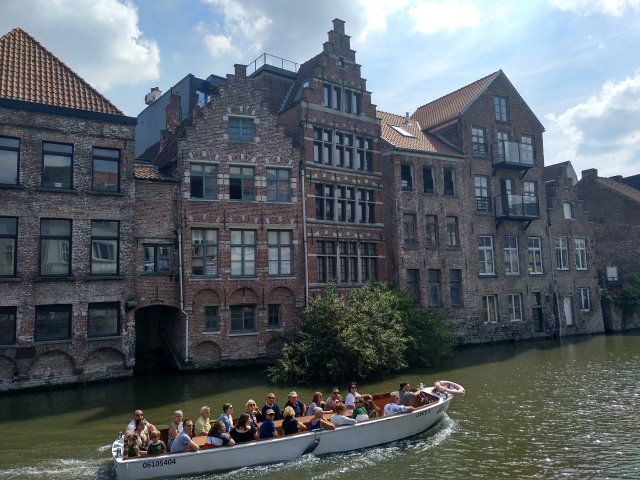 Nachmittags wollte ich gern nochmal etwas durch die Stadt spazieren. Thomas ist in der WG geblieben. Ich bin etwas am Fluss entlang gelaufen und habe so erstmal die Altstadt weitläufig umrundet, bevor ich sie durchquerte. Kurz bevor ich die Gravensteen erreicht hatte, bin ich in einem Straßenfest geladent. Das war schön. Die Straße war schön geschmückt und an manchen Ecken spielte Musik. Am Schloss dann war ich von den vielen Menschen ziemlich erschlagen. Es war in der Stadt wirklich zu merken, dass heute Samstag war. Es war noch viel voller als gestern. Ich hab versucht den ganzen Selfiknipsern etwas auszuweichen und bin am Fluss weiter gelaufen, aber zwischen den vielen Kirchen saßen dort noch mehr Menschen als auf der Brücke. Manche aßen, manche machten Fotos, andere sahen den Touristenschiffen zu. Es wirkte dort wie sehen und gesehen werden; vielleicht noch mehr gesehen werden als sehen. Ich bin dann den BEO Laden suchen gegangen. Dort gibt es regionale bio Lebensmittel. Der Laden war wirklich schön und ziemlich groß und gar nicht teuer. Ich habe dort sogar regionale Schokolade bekommen und die ist total lecker. Schade, dass ich nicht ein bischen auf Vorrat mitgenommen habe. Leider war die Käseauswahl dort nicht so gut. Es ist wirklich zu merken, dass wir nicht mehr in Frankreich sind. In dem Laden konnte man vieles an losen Waren kaufen, auch Mehl, Nüsse und co. Das war wirklich gut. Schade, dass wir solche Läden noch nicht öfter gesehen haben. Jetzt wissen wir aber wonach wir suchen können. Wobei Gent als alternative Stadt in Belgien gilt, so dass die Chancen nicht so gut sind öfter diese Läden zu finden. Und es gibt hier ja auch nicht so viele Bio-Bauernhöfe.