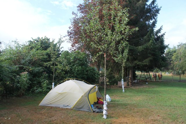 Nach der Anlage trafen wir auch relativ schnell wieder auf Häuser. Wir haben dort angefangen nach einem Schlafplatz zu fragen. Beim zweiten Haus, dass wir fragen wollten war tatsächlich jemand im Garten und nach einigem erklären, dass wir nicht ins Haus wollen, steht unser Zelt jetzt hier. Neben uns stehen zwei Schafe und etwas weiter noch zwei Ziegen und zwei Pferde. Hier gibt es auch noch zwei kleine weiße Hunde. Die beiden waren ganz lustig. Erst bellen sie und wenn Blondi „Hallo“ sagen möchte rennen sie weg. Die Schafe können sich hier frei bewegen, aber das eine ist schon sehr alt und liegt nur und das andere hat Angst vor unseren Hunden. Das hat sich erst etwas mehr bewegt, als die Hunde im Zelt waren. Aber es war zu uns ganz neugierig und kam schnuppern, wenn wir uns ihm näherten.