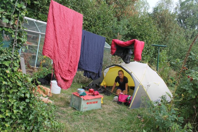 Kurz vor dem nächsten Ort haben wir beschlossen nach Zeltmöglichkeiten zu fragen. Im Ort war, wie die letzten Tage auch, oft keiner da, wenn wir klingelten. Unser Zelt steht jetzt im Garten eines älteren Mannes, Francois. Seine Schwester kam auch noch vorbei, um Hallo zu sagen und den Hunden etwas zum Knabbern zu bringen. Sie wohnt neben an und hat auch einen Hund.