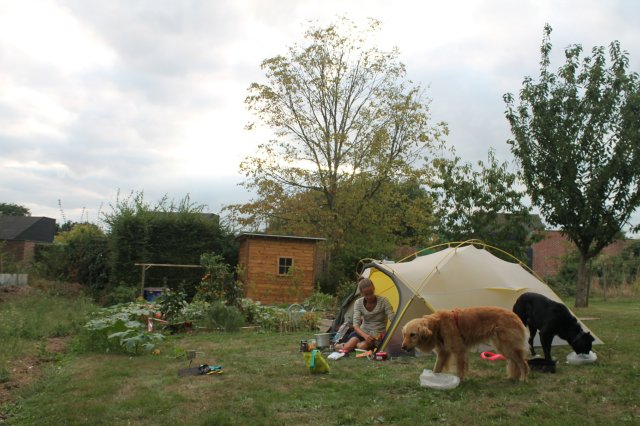 Bei der nächsten Tür hat uns ein vielleicht achtjähriges Mädchen geöffnet, dass ihre Mama geholt hat. Sie, Sina, kam mit der Jüngsten (vielleicht so 4 Jahre). Als wir erzählt hatten, das wir einen Schlafplatz suchen, waren alle gleich ganz aufgeregt. Die Eltern haben das erst besprochen und dann konnten wir tatsächlich im Garten unser Zelt aufstellen. Arne, der Vater, hat sogar davor noch den Rasen gemäht.