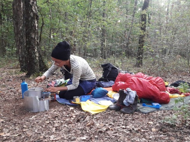 Wir sind erstmal weiter gelaufen. Unsere Stimmung war nicht ganz so gut. Thomas war müde und ich genervt, die Niederlande erstmal verlassen zu haben. Ein Campingplatz war nicht in Sicht und so haben wir nicht sehr erfolgreich angefangen nach Schlafplätzen zu fragen. Die Meisten verwiesen uns an ihre Nachbarn oder an Wiesenstücke, wo sie aber nicht wussten ob sie öffentlich oder privat sind. Das war ziemlich deprimierend. Thomas war so müde, dass er nicht erst zum Pfarrhaus laufen wollte. Es wäre am anderen Ende des Ortes gewesen. Und wild campen? Wir hatten uns natürlich noch nicht schlau gemacht. Also haben wir bei einem Haus angefragt, ob sie sich etwas auskennen, wie strickt es gehandhabt wird. Die erste Frau wusste leider nichts, ist aber mit uns zu ihrem Nachbarn gekommen, um zu fragen. Der wusste auch nichts sicher, war aber ganz zuversichtlich. Wir haben bei ihm also unsere Wasserflaschen gefüllt und sind in Richtung Wald gelaufen. Im Wald haben wir uns ein Plätzchen gesucht und erstmal etwas ausgeruht und überlegt was wir machen. Biwakieren ist ein bischen Grauzone, das wusste ich. Mit dem Zelt könnte es schwierig werden. Thomas ist nochmal auf der Suche nach einer anderen Stelle durch den Wald gelaufen. Als er zurück kam, haben wir angefangen unser Lager aufzubauen. In der Nähe hörten wir Leute Fußball spielen, aber sonst war es ruhig. Wir hatten uns für schlafen unter freiem Himmel entschieden und hofften, dass keiner kommt. Das einzige was immer wieder zu hören war, war ein Flugzeug mit Radar auf dem Rumpf. Es flog auch sehr tief und war dadurch sehr laut. Wir haben keine Ahnung was das dort beobachtete. Wir haben das Flugzeug auch in den Niederlanden schon gehört.