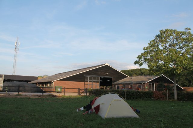 Als wir die ersten Häuser dann getroffen haben, haben wir angefangen nach Schlafplätzen zu fragen. Eine Frau hat uns zu einem Bauernhof geschickt. Ich habe die Wegbeschreibung glaub ich nicht ganz verstanden, auf jeden Fall sind wir statt am Bauernhof an einem Kindergarten gelandet. Der Kindergarten sah wirklich schön aus und das Gelände war sicher mal ein Bauernhof. Schlafen konnten wir hier aber sicher nicht. Dort war ein junger Mann, den wir abgesprochen haben um zu fragen, ob wir wirklich richtig sind. Das waren wir natürlich nicht, aber der Mann hatte einen Bauernhof und hat gesagt, wir könnten bei ihm zelten. Das war so freundlich. Wir mussten nur etwas in Richtung der Stadt zurück gehen. Als wir auf dem Hof ankamen, kam von gegenüber ein alter Hund langsam bellend angelaufen. Unsere beiden haben natürlich gleich laut geantwortet. Der andere Hund war schon so alt und taub, wie uns der ältere Mann im elektrischen Rollstuhl erklärte. Später haben wir erfahren, dass der Mann im Rollstuhl der Großvater ist.