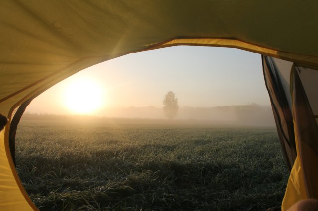 Die Sonne weckte uns heute und der Nebel stand noch auf der Wiese. Alle Grashalme waren mit Tautropfen bedeckt. Ein wunderschönes Bild erwartete uns, als wir das Zelt öffneten.