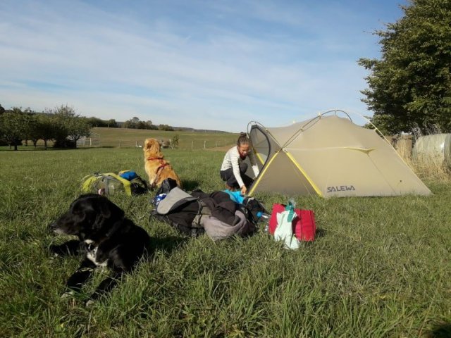 Thomas tat sein Knie immer mehr weh und so haben wir beschlossen, im nächsten Ort einen Schlafplatz zu suchen. Bis dahin war es aber noch ein Stück. Wir mussten den Berg erstmal wieder runter. Die Hunde hatten beide Wildspuren in der Nase und Blondi stellte sich an der Leine immer wieder auf die Hinterbeine. Wir haben aber keine Tiere gesehen.