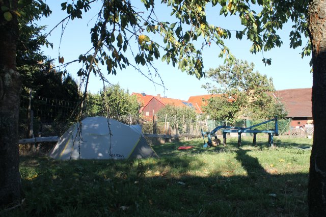 Der Wald war dann auch bald zu Ende. Am Waldrand haben wir die langen Sachen ausgezogen, denn jetzt ging es wieder an Feldern entlang. Wir haben noch einen Ort passiert bevor wir im nächsten Ort mit der Schlafplatzsuche begonnen haben. Da Thomas‘ Knie weh tat, bin ich alleine schnell zum Supermarkt gegangen und Thomas hat mit den Hunden im Schatten auf einer Wiese gewartet. Als ich zurück kam knackte Blondi gerade Haselnüsse und futterte sie auch. Thomas hatte nach dem Weg geschaut und wir gingen weiter. An einem Bauernhof fanden wir ziemlich überraschend und schnell einen Platz. Die Leute sind wirklich freundlich. In einem leer stehenden Haus, dass sie gerade ausbauen können wir sogar die Toilette benutzen.