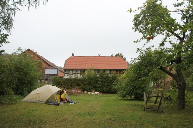 Hier war es heute relativ schwer einen Platz für unser Zelt zu finden. Ein Bauer hat uns seine Wiese angeboten, als wir da aber ankamen, bließ der Wind so doll, dass wir uns nicht getraut haben unser Zelt dort auf zu schlagen. Also sind wir weiter fragen gegangen. Bei einer Frau hatten wir dann Glück. Wir stehen jetzt in einem separaten Garten und sind gut vor dem Wind geschützt. Thomas kocht gerade für uns und ab und zu hören wir die Ziegen, die hier in der Nähe stehen, niesen.