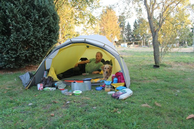 Heute morgen waren wir zum Frühstück eingeladen, bei den Leuten die wir gestern nach einen Platz zum Schlafen gefragt hatten und die uns den Platz gezeigt hatten. Deren Hündin musste in der Zeit ganz leise bleiben, da die Frau Nachtschicht hatte und schlief und unsere Hunde vor der Tür warteten. Die Hündin fand es wahrscheinlich nicht so lustig mit uns in der Küche, aber für ein paar Streicheleinheiten blieb sie bei uns… Sie sieht Nala, Blondis Mama, wirklich sehr ähnlich. Es war ein schönes Gespräch und wir haben nochmals unseren Weg angeglichen.