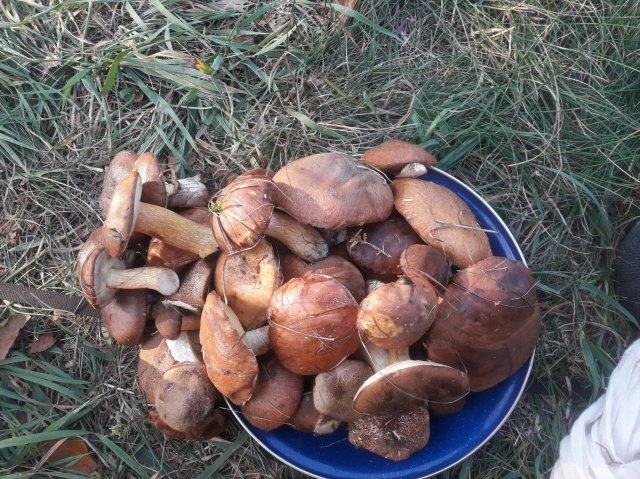 Während unserer Mittagspause im Moos, hörten wir lange Kraniche über uns. Sie waren jedoch zu weit entfernt, um sie zu entdecken. Nach der Mittagspause haben wir dann die ersten Pilze gefunden. Wir haben unsere erste Grause Glucke und unsere ersten Butterpilze entdeckt. Die Grause Glucke haben wir aber im Wald gelassen, weil wir nicht wussten, wie wir sie zubereiten müssen. Von den Butterpilzen haben wir heute ganz viele gefunden. Sie zogen sich immer wieder, wie an einer Kette, neben dem Weg entlang. Wir haben aber auch alte Bekannte wieder gefunden, wie den Rotfuß-Röhrling, die Ziegenlippe und kleine Steinpilze. Es war wirklich schön, sie zwischen dem Gras zu entdecken.