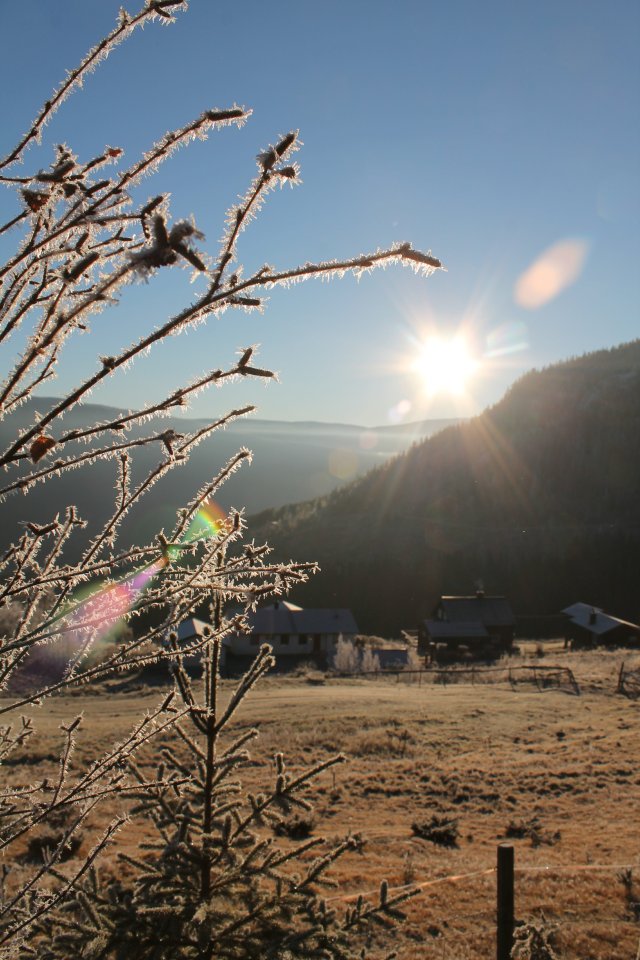 Heute früh war alles weiß beglitzert und die Sonne kam langsam über den Berg und tauchte alles in goldenes Licht.