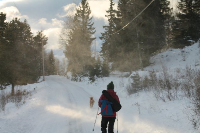 Kurz bevor wir am Hof waren sind Blondi und Marvin nochmal allein losgezogen und wir standen erstmal pfeifend und rufend da. Als sie dann zurück waren, waren sie ziemlich aus der Puste. Bis zum Hof sind sie dann aber nah bei uns geblieben. Wenn wir sie riefen, konnten sie gar nicht so schnell stoppen, wie sie wollten, da die Straße so rutschig war.