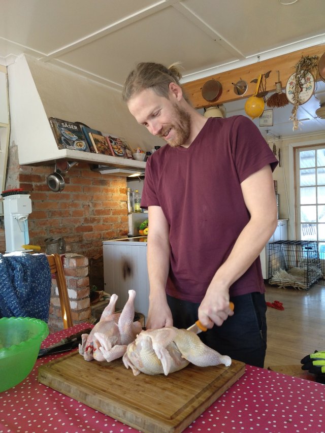 Thomas konnte dann die Hühner für hier vorbereiten und ausnehmen. Mir reichte das Zusehen. Ich wollte es nicht versuchen. Als alles vorbereitet war, ist Maria mit den Sachen nach Gøteborg gefahren.