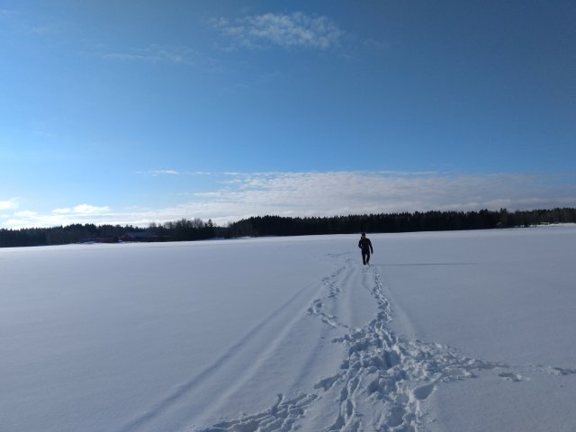 An der besagten Stelle haben wir leider keine Elche getroffen, aber wir haben von weitem viele Rehe gesehen. Wir sind dann einfach so eine Runde spazieren gegangen und im Schnee haben wir die Spuren von Füchsen und Rehen gesehen. An einer Stelle haben wir sogar recht frische Elchspuren gesehen. Denen sind wir dann gefolgt.