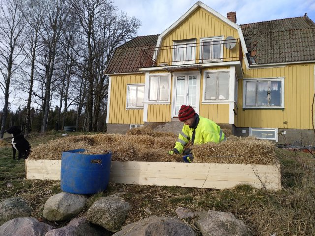 Nach dem Mittag haben wir ein Frühbeet angefangen zu bauen. Wir haben die Umrandung aus Stohballen platziert und die Fenster schon mal aufgelegt. Die Fenster müssen wir morgen noch etwas reparieren, bevor wir mit dem Inneren des Beetes anfangen können. Bei den Fenstern fehlen einige Scheiben, so dass wir die morgen ersätzen und festmachen müssen.