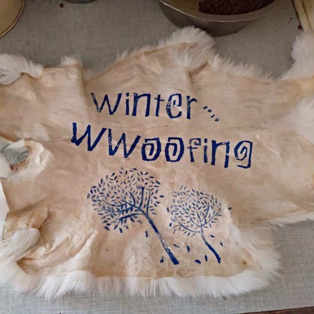 Ich habe in der Zeit eines der Kaninchenfelle bestempelt und Beewraps gemacht. Maria hat mir eine gute Variante dafür gezeigt. Die Beewraps duften so gut.