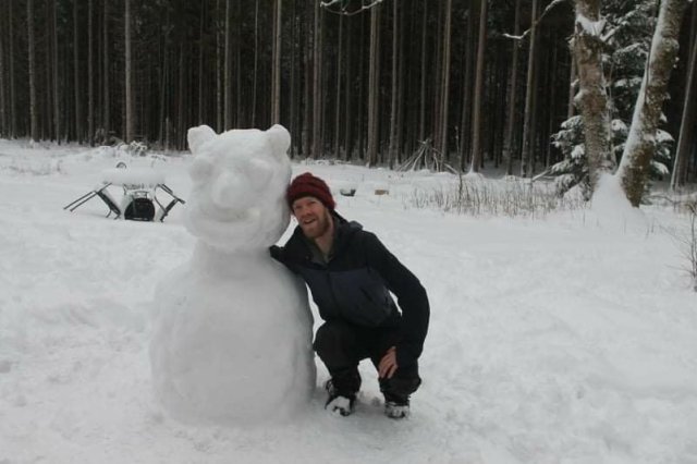 Während ich drinnen einen Kaffee vorbereitet habe, hat Thomas angefangen einen Schneemann zu bauen. Der Schnee war heute perfekt dafür. Schön klebrig, da es nicht so kalt war. Marvin war erst gar nicht begeistert von der großen ersten Kugel und hat sie angebellt. Am Ende ist es ein ganz besonderer Schneemann geworden. Bis zum Abend hatte sich Marvin dann auch an ihn gewöhnt.