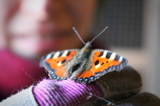 Als wir mit dem Umzug der Wachteln fertig waren, habe ich einen Schmetterling am Fenster entdeckt. Er kam auf meinen Handschuh und nach den Fotos, habe ich ihn nach draußen in die Sonne gebracht.