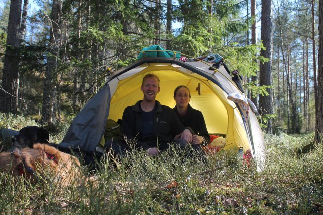 Für uns ging es nochmal kurz auf die Straße, bevor wir in Richtung Biwakplatz in den nächsten Wald abbogen. Hier am Platz ist der Wald wieder ganz anders. Es gibt viel Fels auf dem Flechten und Moose wachsen. Die Bäume sind wirklich hoch und der Wald ist wieder etwas lichter. Es gibt viele kleine Blaubeersträuche, wobei diese nur knöchelhoch sind. Die Sonne scheint hier wunderbar. Wir waren relativ früh hier, so dass wir noch Zeit hatten etwas herum zu gehen und auch endlich unser Sprossensäckchen zu nähen. Wir haben heute Abend auch das erste Mal abends draußen gegessen, da die Sonne noch so warm war.
