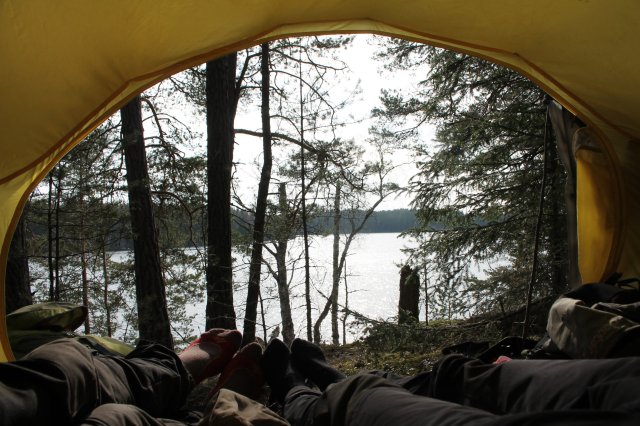 Wir haben uns dann einen anderen Platz zum Übernachten gesucht. Wir konnten den Biwakplatz vom Ufer aus sehen. Er sah wirklich sehr schön aus. Jetzt haben wir dafür eine tolle Aussicht. Wir mussten unseren Plan für morgen dann nochmals umplanen, da wir eigentlich mit dem Boot, der Insel und einem weiteren Boot den See überqueren, statt herum zu gehen, wollten.