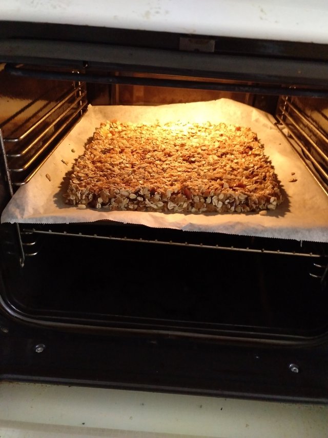 Wir haben uns auch wieder daran gemacht, unsere Müsliriegel selbst zu machen. Das ging bis jetzt nur in Helsinki, da wir hier in einer Wohnung waren bzw. sind. Es gibt im Internet unzählige Rezepte dafür. Für die letzten Riegel haben ich eine handvoll Mandeln klein geschnitten, einige getrocknete Aprikosen und Datteln. Das ganze mit etwas Mehl gemischt, damit die Früchte nicht so aneinander kleben. Dazu kamen dann ca 380g Müsli. (Das war hier in etwa die halbe Tüte.) Dazu hatte ich von zwei großen Äpfeln Apfelmus gekocht. Davon kam die Hälfte dazu. (Ich hab zwei Bleche am Ende gebacken. Der Rest Apfelmus war für das zweite Blech). Dazu kamen noch etwas Leinensamensirup und 200g cremiger Honig. Unser war relativ fest, deshalb habe ich ihn erst etwas im Wasserbad verflüssigt. Das alles wird gemischt und auf ein Backblech mit Backpapier gegeben. Ich forme aus der Masse dann ein Rechteck und versuche es möglichst gleichmäßig glatt zu bekommen. Das ganze kommt für 20 Minuten bei 150 Grad in den vorgewärmten Backofen. Rausnehmen. Riegel im warmen Zustand schneiden. Auskühlen lassen und anschließend in unsere Beewraps verpacken.