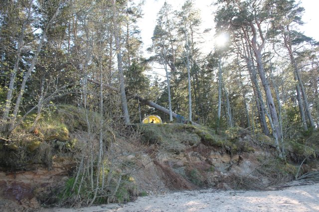 Jetzt steht unser Zelt an einem Feuerplatz an der Steilküste. Wir haben eine tolle Aussicht, nur leider mussten wir das Zelt schon schließen, da es kalt wurde. Wir hören ein Motorboot auf der Ostsee, das Wellenrauschen und Möwengeschrei.