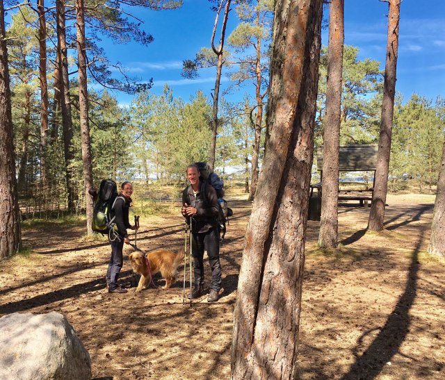 Heute morgen ging es bei uns wieder spät los. Unsere Hunde haben uns zwar immer wieder etwas geweckt, wenn sie mal wieder bellen mussten, aber wir sind immer wieder eingedöst. Als wir dann aufgestanden sind, war Kathrin gerade bei den Hunden draußen.Wir haben erstmal einen Kaffee gemacht und getrunken. Wir hatten gesagt, dass wir den Vormittag ruhig angehen und noch dort verbringen. Kathrin war bis mittags dann arbeiten. Wir haben in der Zeit unsere Wäsche gewaschen, Rucksäcke gepackt, waren mit unseren Hunden draußen…Als sie zurück kam, konnte ich noch schnell an ihren Computer meine Steuererklärung vorbereiten. Endlich habe ich das richtige Feld gefunden. Mit dem Handy bin ich fast verrückt geworden, da es die Homepage nie passend angezeigt hat.Dann ging es los. Kathrin hat uns noch zum Grillplatz an den Strand gefahren. Von dort ging es dann immer weiter am Strand oder nahe zu ihm entlang. Kurz vor einem kleinen Hafen mussten wir quasi abbiegen. Kathrin hatte uns schon gewarnt, dass der Weg dort nicht so gut ausgeschildert ist. So war es auch und wir mussten immer wieder auf die Karte gucken. Zwischendrin standen wir aber von lauter grün umgeben an einen wundervollen Platz. Das war so gut. Dann ging es halb am Strand, halb in den Dünen weiter. Eigentlich sollte der Weg größtenteils in den Dünen lang gehen oder bzw hinter dem Strand, aber oft waren dort Gärten und kein Weg mehr zu sehen oder der Weg war zu erahnen, aber von Rosen zugewachsen. Also sind wir immer wieder auf den Strand ausgewichen. Hier war eher Steinstrand und das Laufen war angenehm. Als der Weg dann wieder besser war, war er auch gleich an jedem dritten Baum markiert. Es ging unter den Pinien durch die Dünen, immer an der Küste entlang. Es war ein wirklich schöner und angenehm zu laufender Weg.Wir sind an ein kurzes Stück Steilküste gekommen. Und dann waren wir auch schon der nächsten Stadt nahe. An einem Fluss konnten wir Wasser für uns auffüllen und dann einen Platz für uns suchen. Der Fluss war wie eine kleine Oase. Ein schöner Platz.Nicht viel weiter haben wir unter den Pinien ein kleines Stückchen grün entdeckt und unser Zelt aufgeschlagen. Wir haben leider keine guten Heringe für Sandboden mit, so dass wir immer nach etwas mehr Grün und damit Halt suchen.Es ist wunderbar ruhig hier und es weht auch kein Wind. Die Ostsee liegt wie ein Spiegel da. Wir können unseren morgigen Weg auf der anderen Seite der Bucht schon quasi sehen.