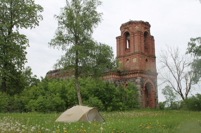 Kurz vor Panga fing es an zu regnen. In Ort sind wir etwas vom Weg abgezweigt, um schneller zu der alten Kirche zu kommen. Die Kirche ist nur noch eine Ruine und auch das Pfarrhaus verfällt. Es ist zu sehen, dass jemand mit renovieren des Hofes mal angefangen hatte, aber momentan sieht es eher nach Verfall aus. Das Pfarrhaus und die Kirche waren bestimmt mal wunderschön. Unser Zelt steht jetzt auf jeden Fall auf der Wiese nahe der Kiche. Auf das Zelt prasselt von draußen der Regen und spielt uns ein Lied.
