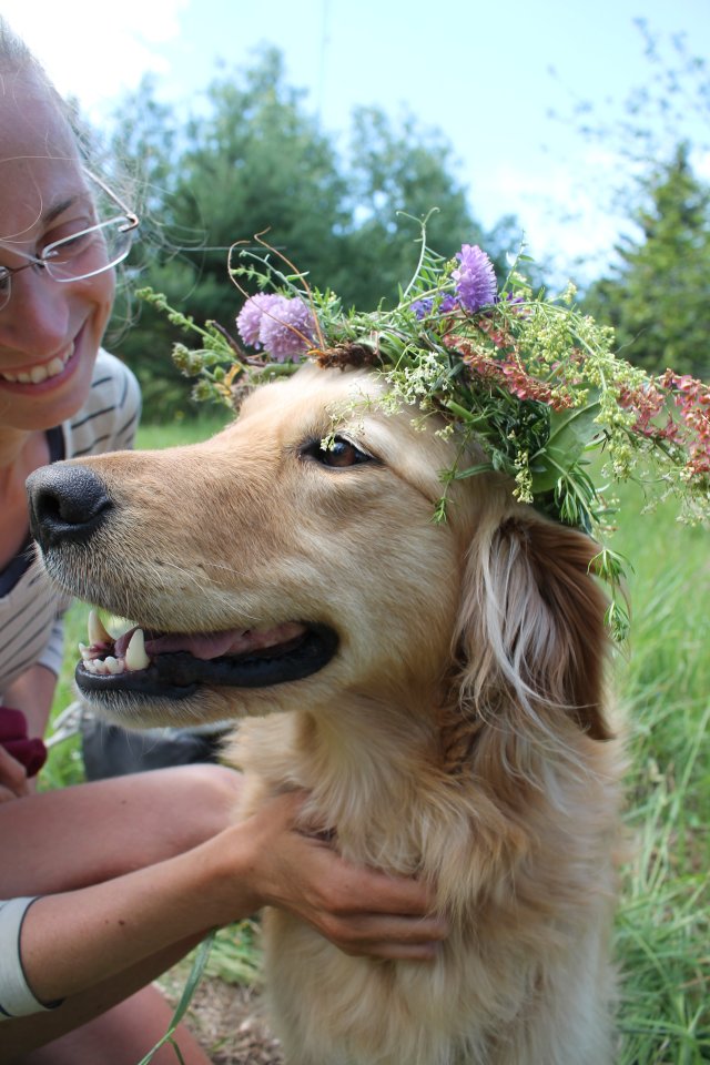 Als wir den E9 wieder trafen, war wie fast immer keine Ausschilderung und wir haben auch gleich unseren Abzweig zur Brücke, um den Fluss zu überqueren verpasst. Die Brücke war eine alte Hängebrücke und nur schlecht passierbar. Thomas ist auf der Hälfte wieder umgedreht, da es zu gefährlich war. Es fehlten Bretter und Metallseile, die nur durch Plastikkordeln ersetzt wurden. Mit unseren schweren Rucksäcken war es zu riskant die Brücke zu passieren. Wir sind also zum Abzweig zurück gegangen und sind dem Waldweg weiter gefolgt. Dieser brachte uns zur Straße und auf ihr ging es über die nächste Brücke. Nach der Brücke ging es direkt wieder auf einen Waldweg. In einer Pause habe ich einen Blumenkranz geflochten. Er passte Blondi wirklich gut.