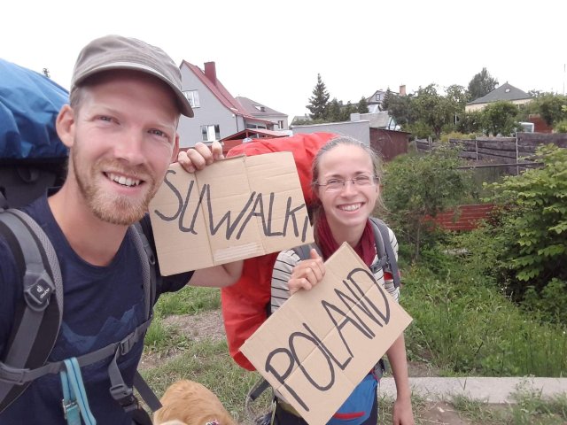 Am Stadtrand haben wir Pappen mit unserer Richtung beschrieben und uns an einer Ausfahrtsstraße damit hingestellt. Nach einer Zeit hat ein Ehepaar angehalten, um uns zwei Kilometer zu einer größeren Straße mitzunehmen. Die größere Straße hat sich aber leider als nicht wirklich gut zum Anhalten herausgestellt. Es waren viele LKW unterwegs und wir standen nahe einer Tankstelle hinter einem Fernstraßenkreuz, d.h. die Autos mussten sich in andere Spuren einordnen und hatten keine Zeit zum Schilder lesen. Auf unseren Schildern stand schon die erste größere Stadt in Polen. Wir haben dann nochmal ein Schild mit der nächsten litauischen Stadt gemacht, aber auch da hatten wir keinen Erfolg.
