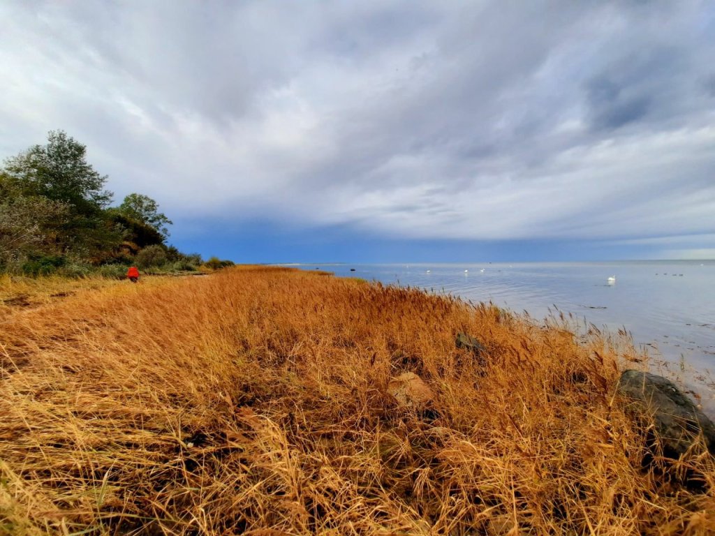 Nach dem Ort ging dann der Weg normal weiter. Wir konnten einfach ganz lange immer am Strand entlang gehen. Wir konnten dabei Vögel beobachten und die Wolken. Der Regen hatte auch aufgehört. Wir sind entlang der Steilküste gegangen und konnten die vom Wasser gespülten Höhlen bewundern. Wir sind über tausende von angespülten Miesmuscheln gelaufen und durch Schilf. Und wir sind über und unter umgefallene Bäume geklettert.