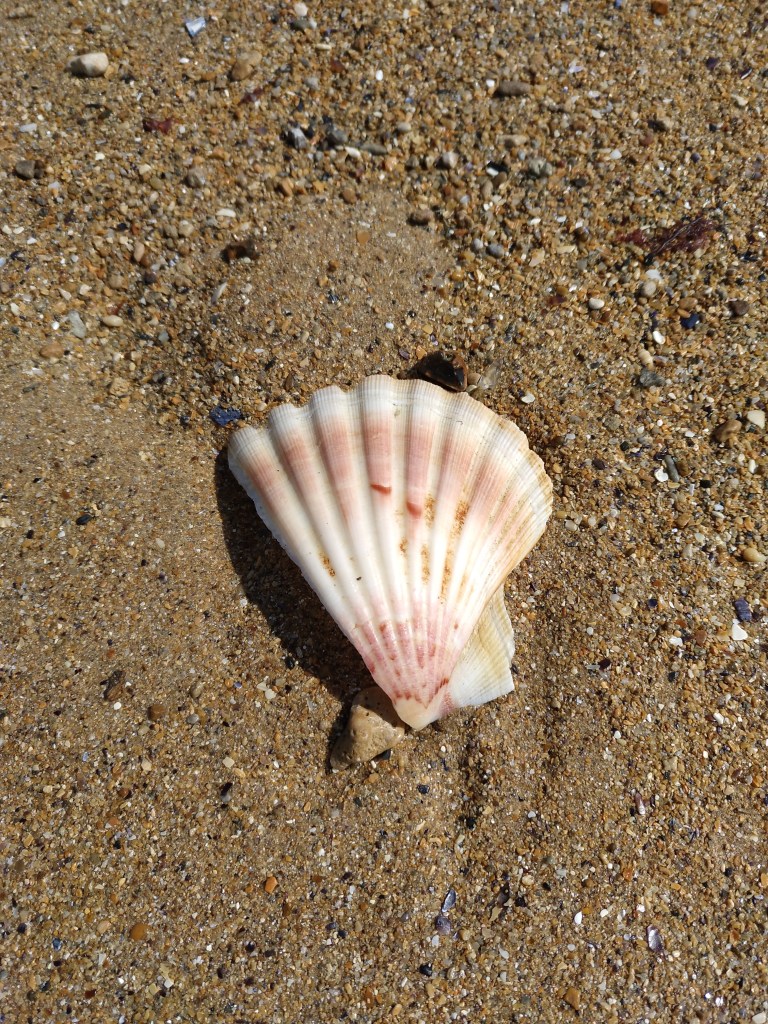 Nach dem Packen sind wir dann ans Meer gefahren. Es ist immer noch richtig windig und gerade am Strand befindet sich eine Menge Sand mit in der Luft. Der Strand war total leer und so konnten wir mit den Hunden ein Stück gehen. Wir haben ein paar Jacobsmuscheln gefunden und hns vom Wind treiben gelassen.