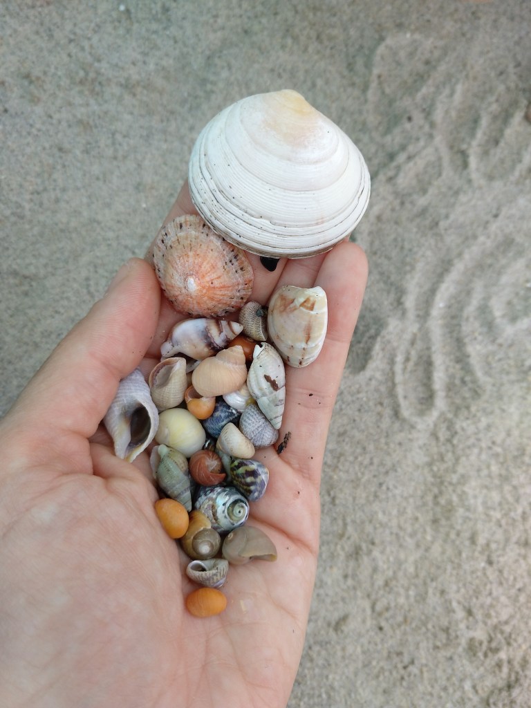 Am Nachmittag waren wir dann nochmal am Strand. Thomas und Marvin waren schwimmen und ich saß mit E. unter der Strandmuschel. Und dann haben wir natürlich auch noch getauscht, dass ich auch ans Wasser konnte zum Muscheln suchen.