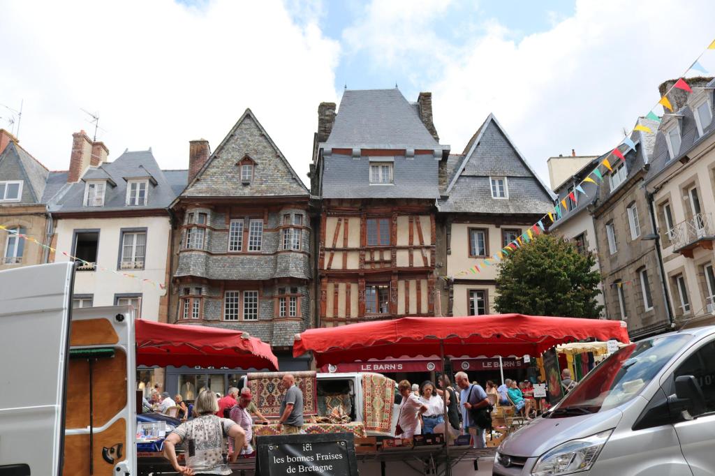 Der Markt auf der Hangseite. Und so standen auch einige Marktstände an ganz schön steilen Stellen. Die Häuser bestanden aus dem typischen Granit und zwischendrin gab es immer mal ein Fachwerkhaus. Es wirkte alles sehr stimmig. Am Fluss, wo der andere Marktteil war, gab es viele Bänke und Blumen. Eine Uferseite war immer „Grün“ gehalten und zum Teil auch ohne Autoverkehr. Das war schön und machte auf uns einen sehr freundlichen und angenehmen Eindruck.