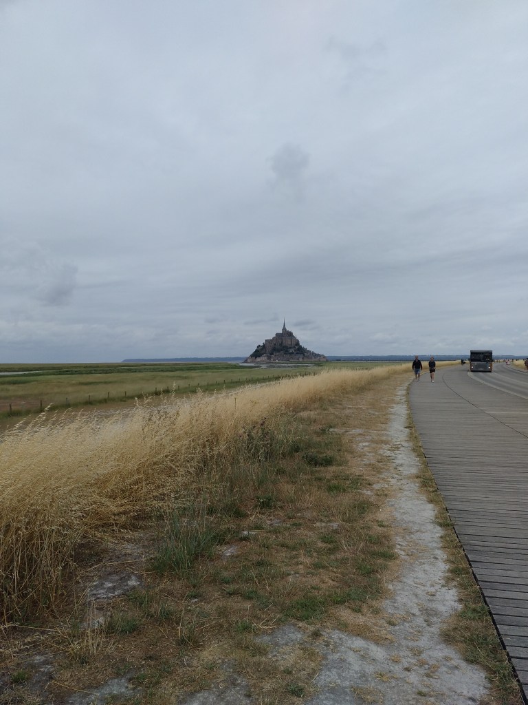 Man kann die knapp 3 Kilometer vom Parkplatz bis zum Mont St.- Michel mit einem kostenlosen Shuttle fahren oder laufen. Wir sind natürlich gelaufen. Wir hatten für unseren Geschmack perfektes Wetter. Es war bewölkt und windig und hat auch erst etwas geregnet. Dadurch war es nicht so warm und der Weg zum Berg war angenehm zu gehen.